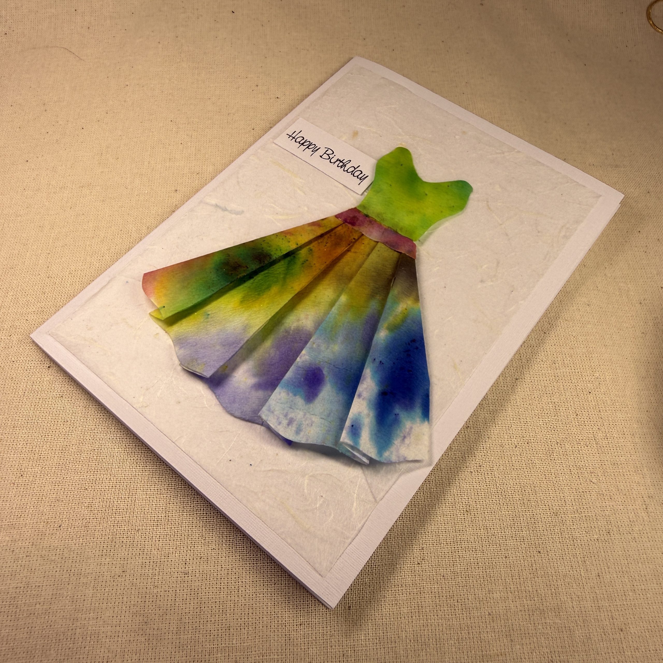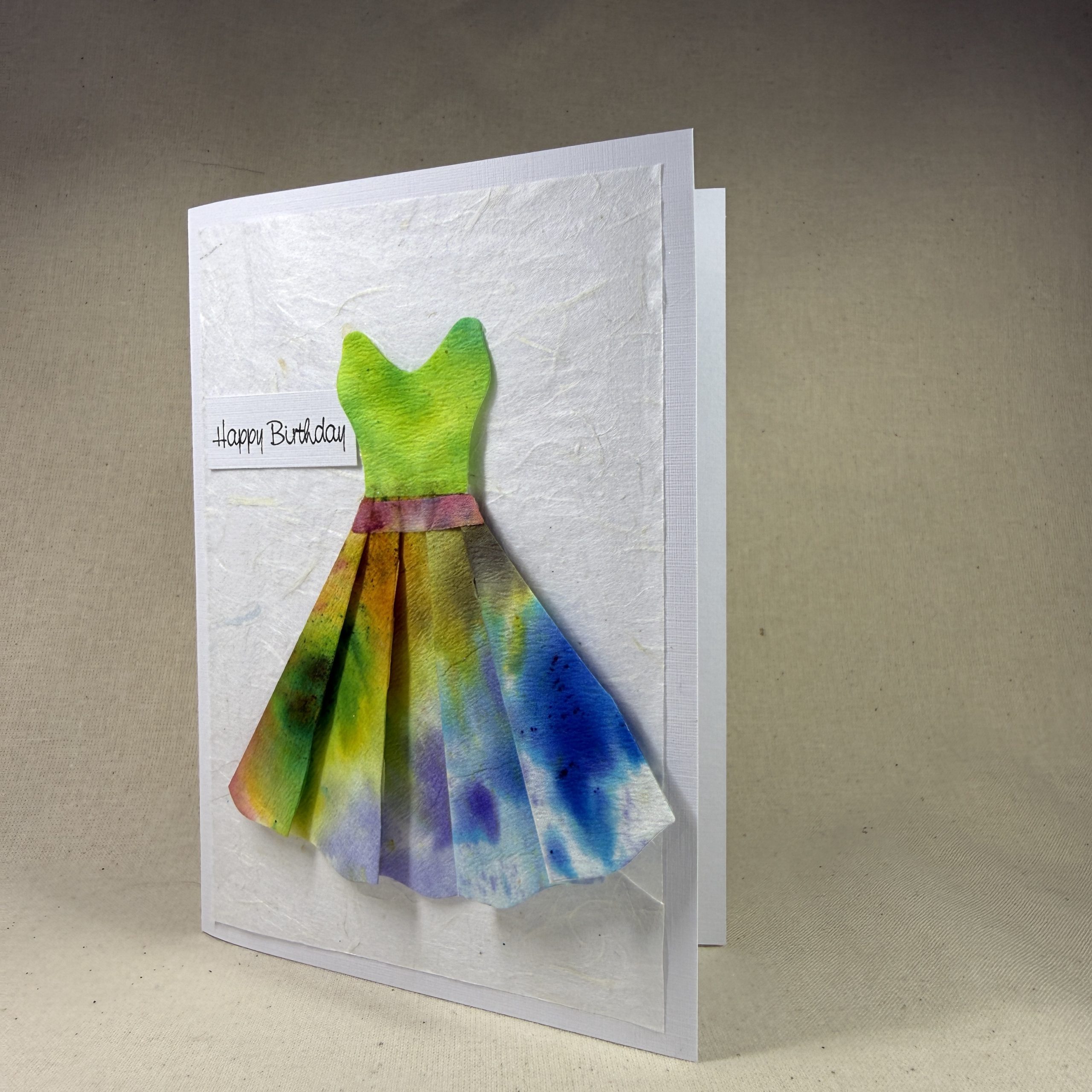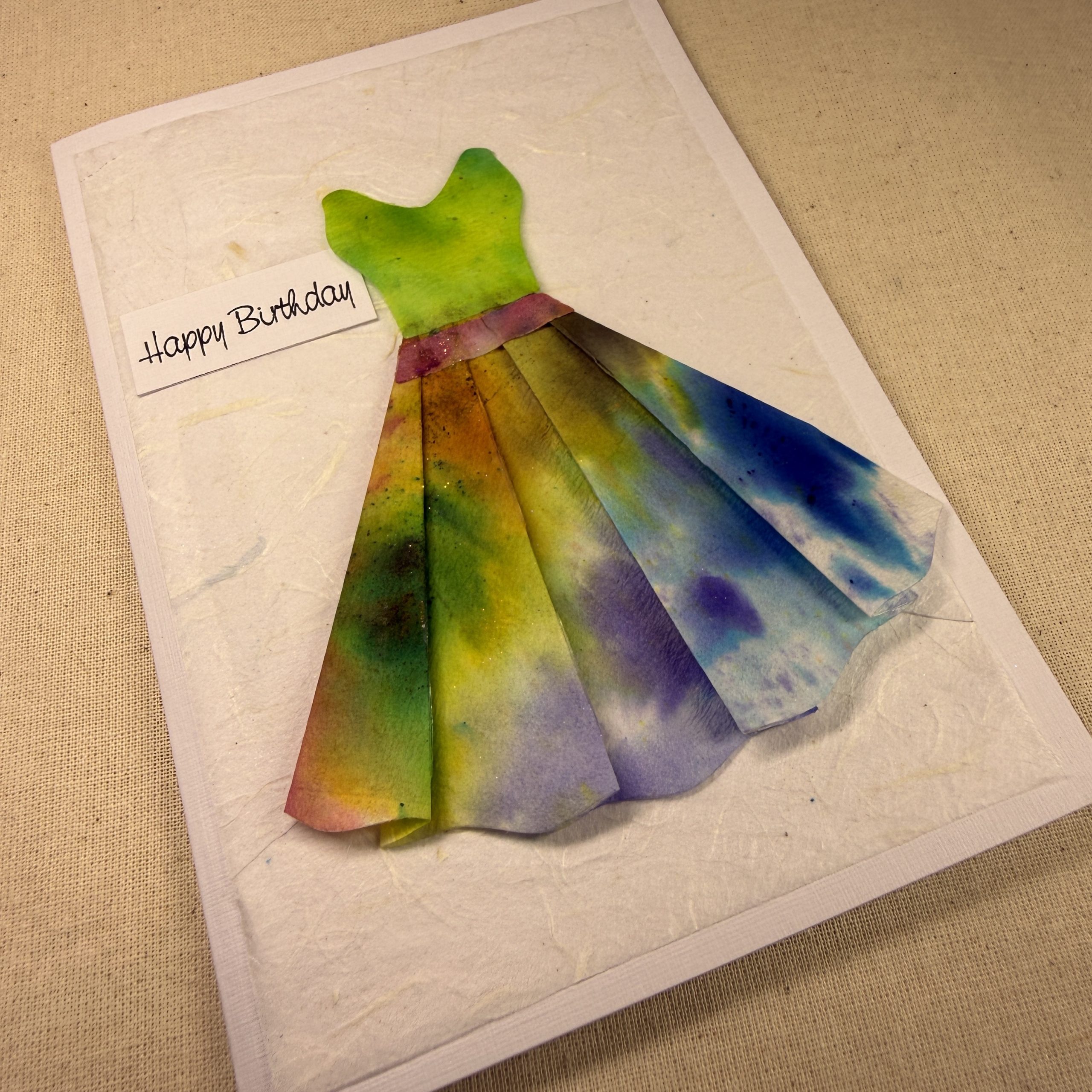 Hand painted dress on a hand crafted birthday card. The dress has been cut from hand painted and embossed coffee filter paper. One of a kind, original art on a card.